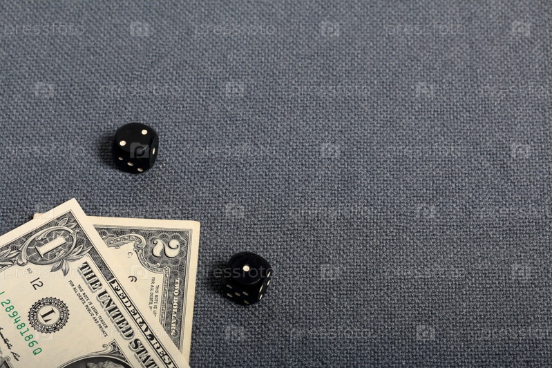 Черные игральные кости с белыми отметинами. Они лежат на поверхности, покрытой грубой серой тканью. Рядом две банкноты. Один доллар и два доллара