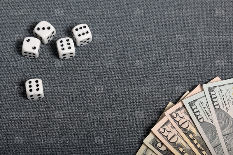 Белые игральные кости с черными отметинами. Они лежат на поверхности, покрытой грубой серой тканью. Рядом лежат несколько долларовых купюр разного достоинства
