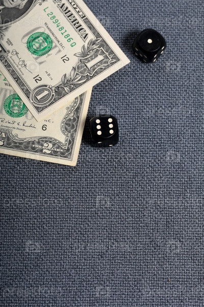 Черные игральные кости с белыми отметинами. Они лежат на поверхности, покрытой грубой серой тканью. Рядом две банкноты. Один доллар и два доллара