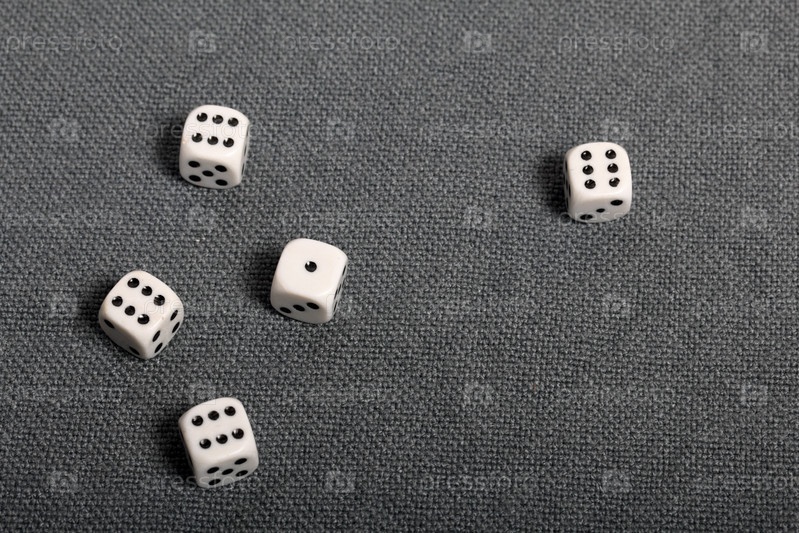Белые игральные кости с черными отметинами. Они лежат на поверхности, покрытой грубой серой тканью. Вид сверху