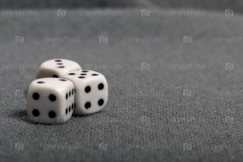 Белые игральные кости с черными отметинами. Лягте на поверхность, покрытую грубой серой тканью