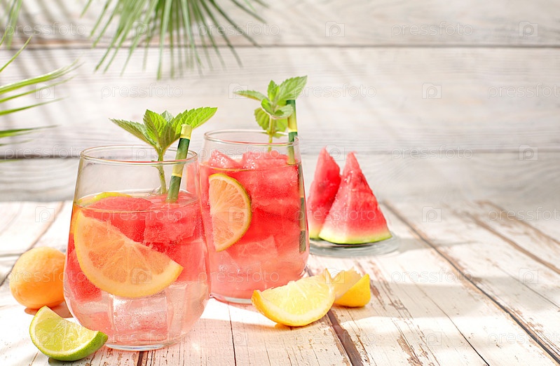 Ледяной домашний лимонад или коктейль с мятой, арбузом и фруктами на солнечном столе, рецепт освежающего летнего напитка, детокс-диета и концепция похудения, меню для ресторана,