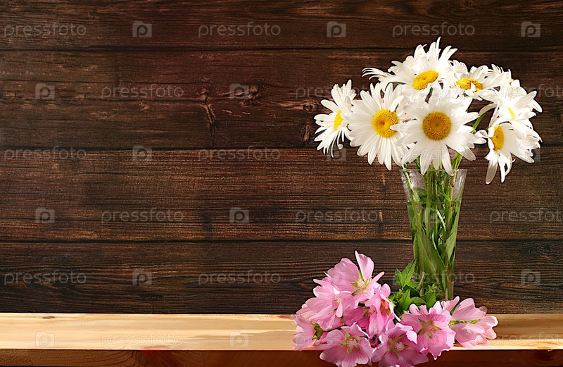 Красивые цветы ромашки в вазе на деревянном фоне, летний баннер для рекламы продукции, абстрактная цветочная композиция, деревенский стиль, праздничная открытка, выборочный фокус