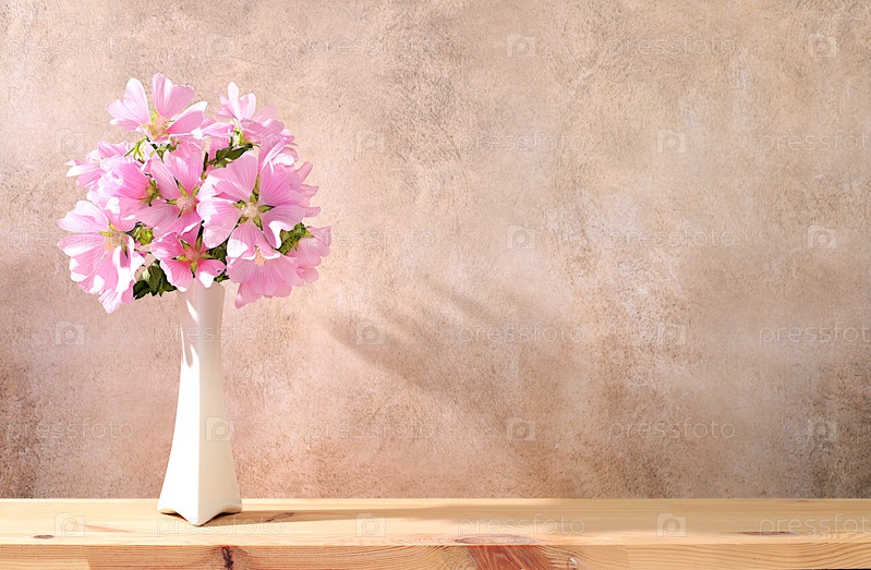 Красивые цветы мальвы в вазе на солнечном фоне, летний баннер для рекламы продукции, абстрактная цветочная композиция, деревенский стиль, праздничная открытка, выборочный фокус
