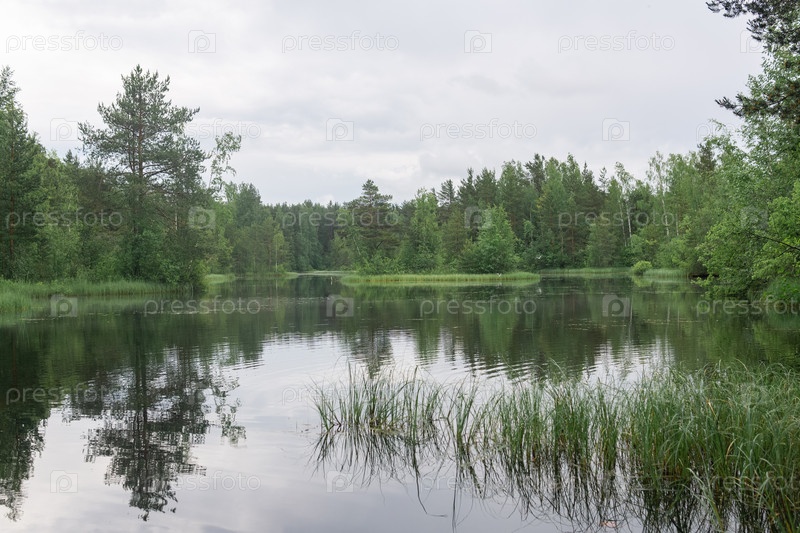 Спокойное лесное болотистое озеро в пасмурную погоду