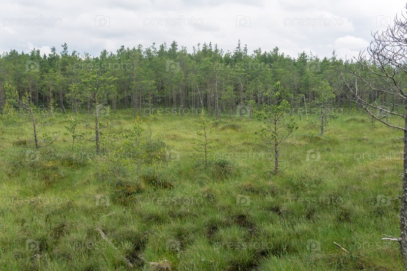 Край болотистого ландшафта в пасмурный день с сосновым лесом на заднем плане