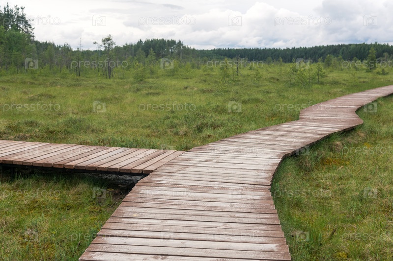 Деревянные дорожки на туристическом маршруте через болото, познавательная природная тропа в охраняемом болотистом ландшафте