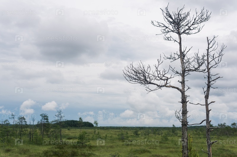 Дикий травянистый пейзаж болота в пасмурный день, естественный болотный фон с сухими деревьями на переднем плане
