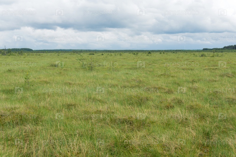 Дикий большой травянистый ландшафт болота в пасмурный день