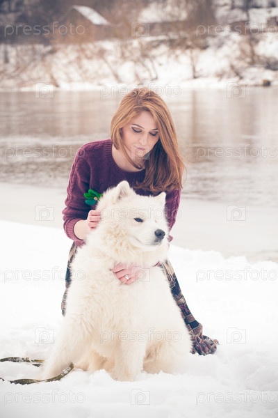 Девушка с собакой породы самоедская лайка