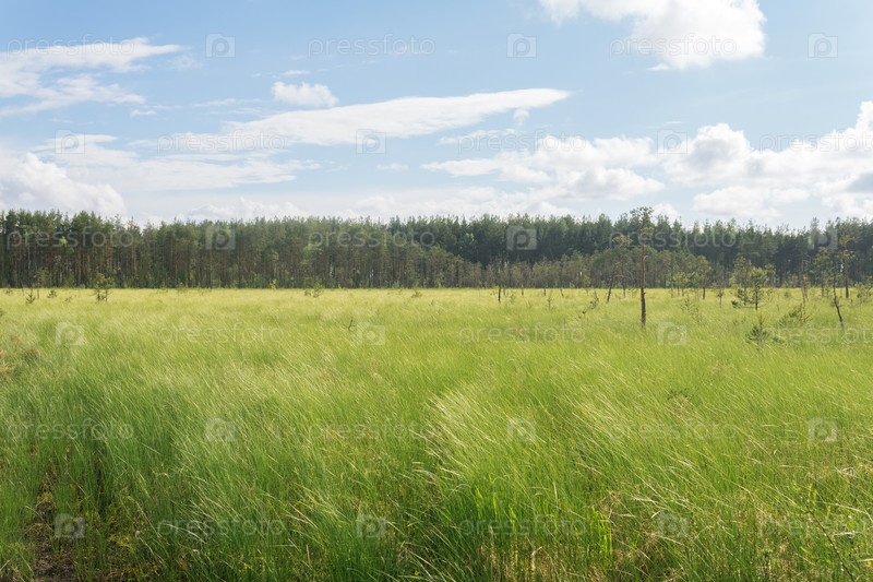 Дикий травянистый ландшафт болота в солнечный день