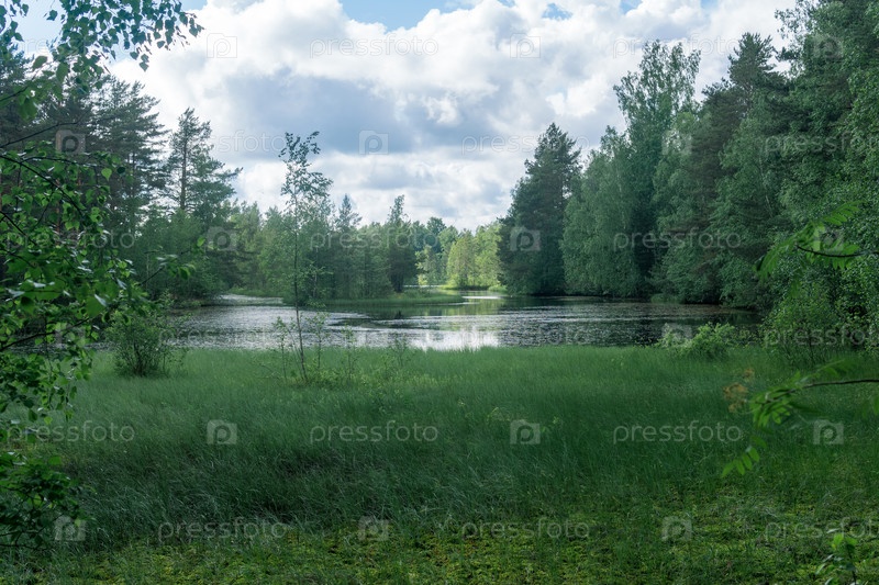 Спокойное лесное болотистое озеро с травянистыми болотистыми берегами
