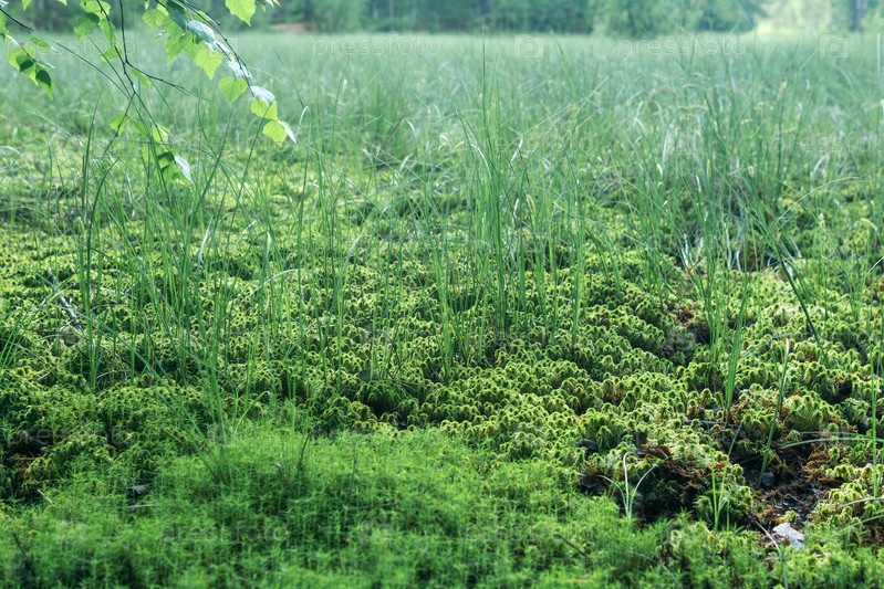 Размытая болотная растительность крупным планом, мшистые кочки и осока