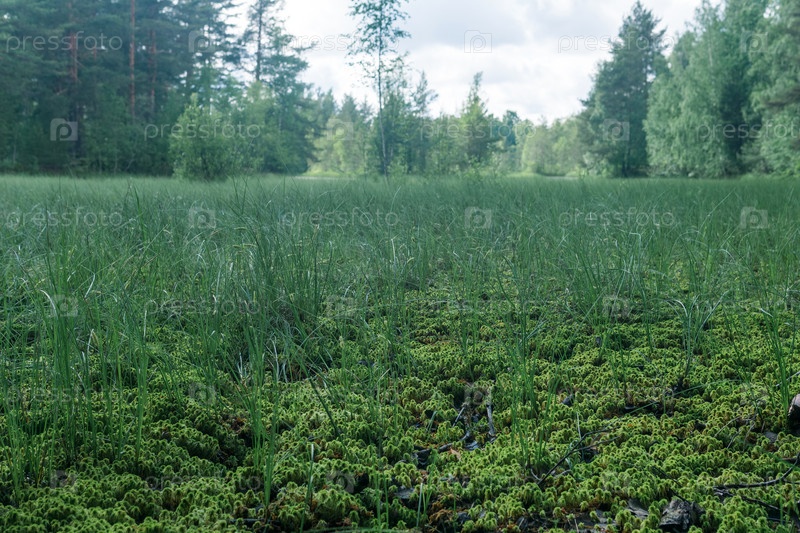 Размытая болотная растительность крупным планом, мшистые кочки и осока, на заднем плане размытый пейзаж