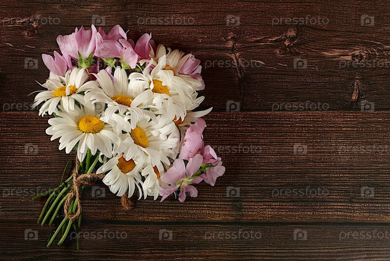 Букет цветов ромашки и мальвы на деревянном фоне, летний баннер для рекламы продукции, абстрактная цветочная композиция, деревенский стиль, праздничная открытка, выборочный фокус