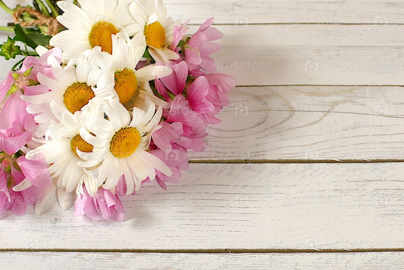 Красивые цветы ромашки и мальвы на деревянном фоне, летний баннер для рекламы продукции, абстрактная цветочная композиция, деревенский стиль, праздничная открытка, выборочный фокус