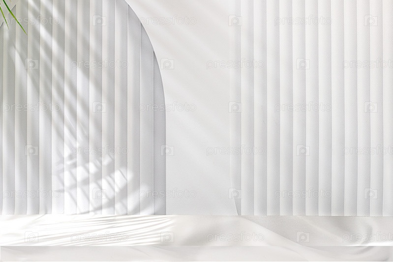 Пустой подиум премиум-класса с тенями тропических пальмовых листьев на серой стене, минимальный абстрактный фон для презентации косметической продукции. шаблон для дизайна, подиум на постаменте, выборочный фокус
