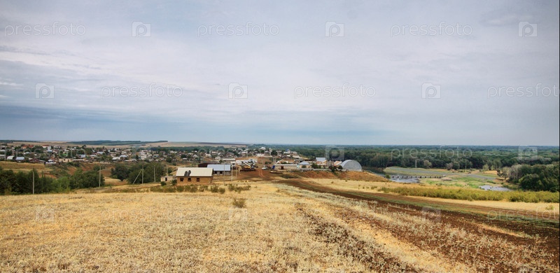 Широкая панорама с видом на русскую деревню летом в пасмурный день