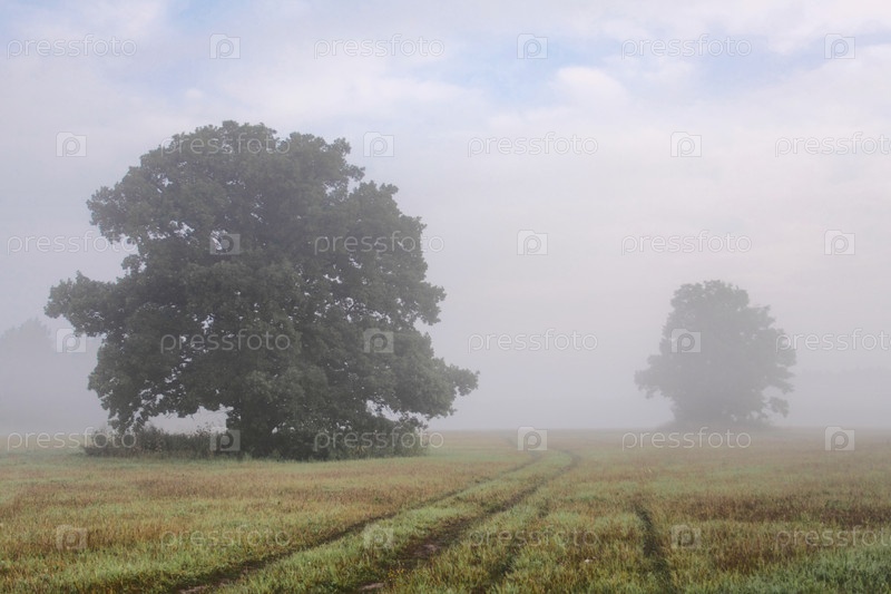 Два больших дерева в тумане утром