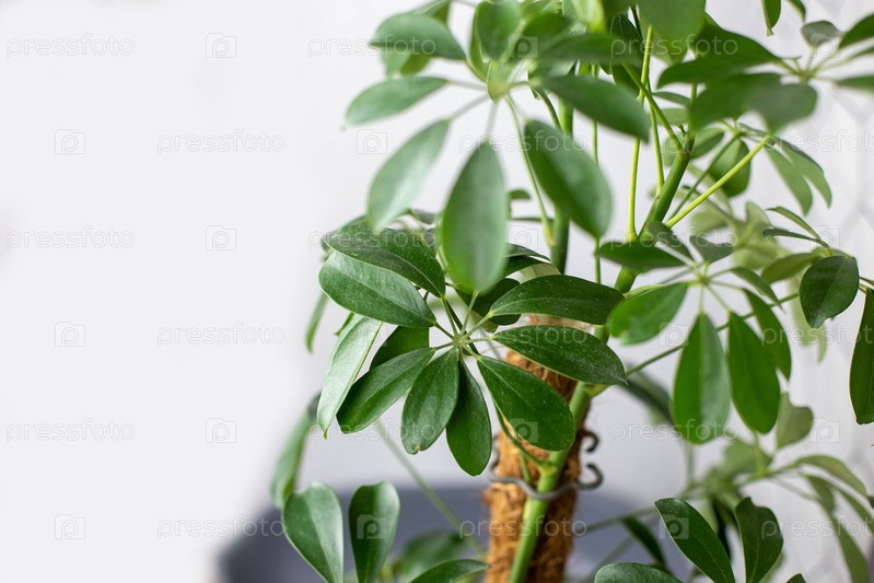 Цветок Шеффлеры крупным планом с пыльными листьями