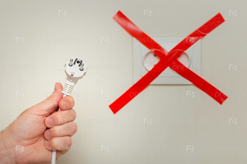 Мужчина держит белый шнур возле электрической розетки, перевязанный красной лентой крест-накрест