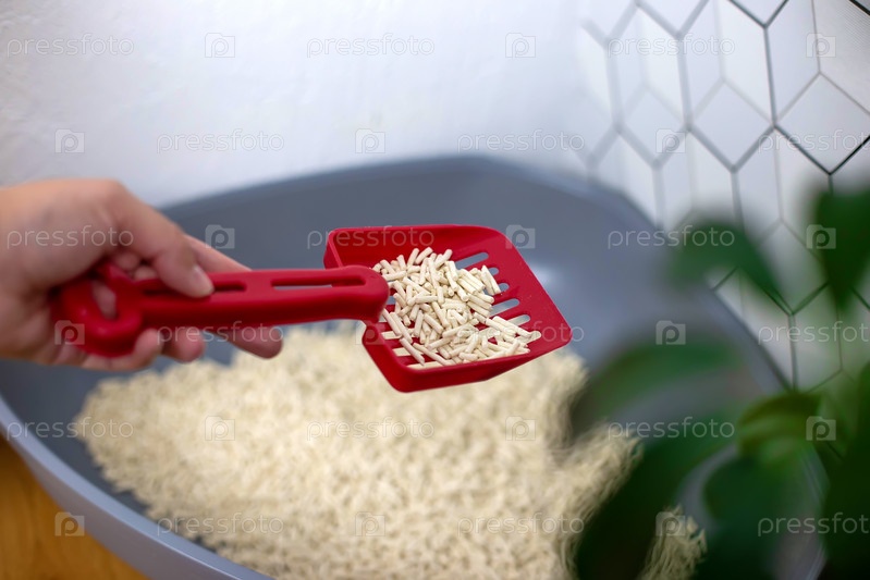 Женская рука с красной лопаткой с кучей гранул светлого естественного кошачьего наполнителя,