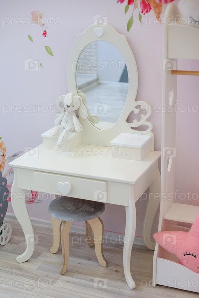 Элегантный белый детский столик с овальным зеркалом в комнате