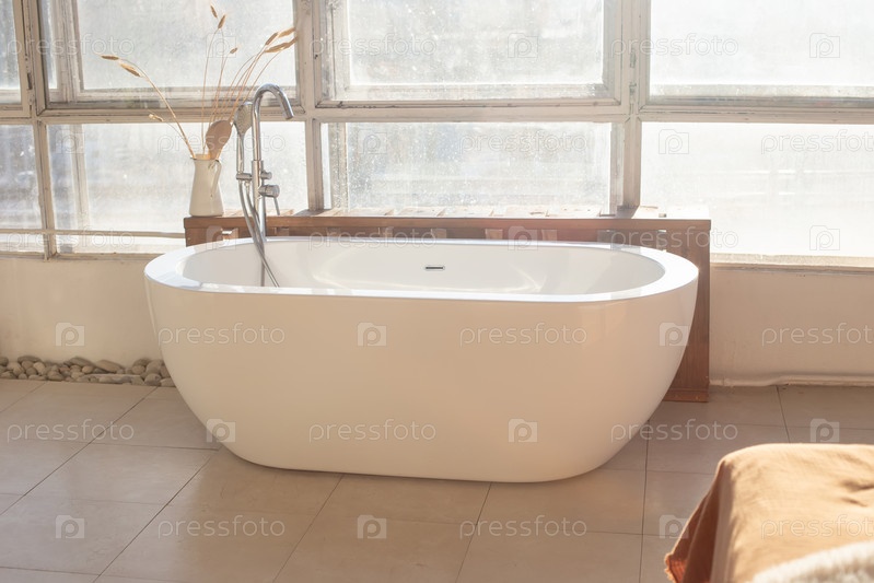 Большая белая ванная комната возле большого окна с солнечным светом, в индустриальном стиле