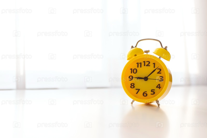 На белом столе у окна с белыми шторами стоит желтый будильник
