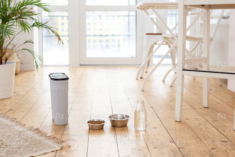 Две миски для животных и серый контейнер с кормом для животных стоят на деревянном полу в светлой кухне