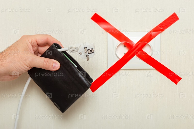 Мужчина держит в руке кошелек, на котором свисает белый шнур с вилкой рядом с электрической розеткой