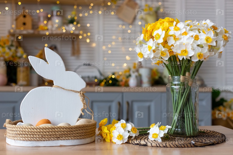 На столе стоит корзина с деревянным белым кроликом и натуральными яйцами