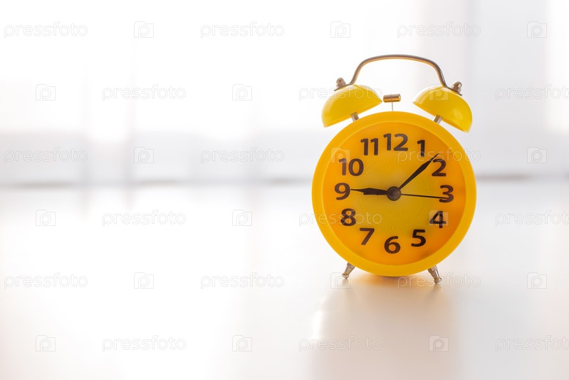 Желтый будильник стоит на белом столе у окна с белыми занавесками
