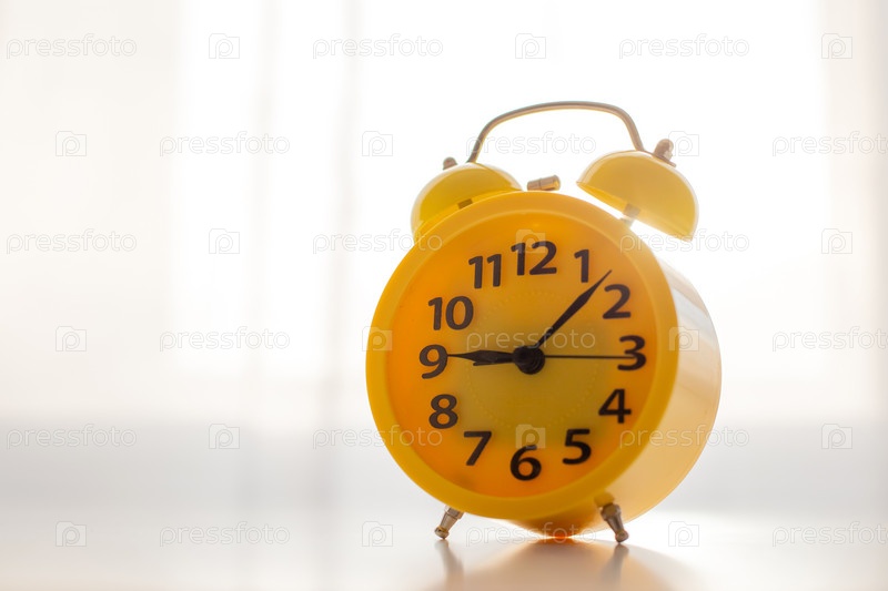 Желтый будильник стоит на белом столе у окна с белыми занавесками