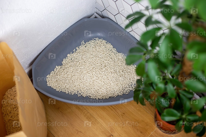 Угловой лоток для кошек из серого пластика со светлыми гранулами наполнителя, для дома