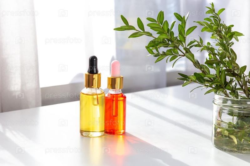 Две бутылки желтого цвета и бутылка розового косметического органического масла стоят на белом столе