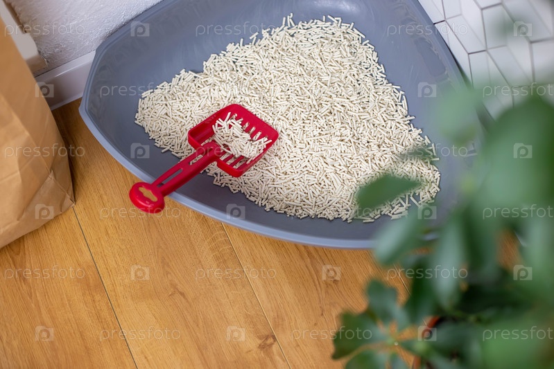 Серый пластиковый угловой лоток для кошек с комкующимся наполнителем «Гранулы естественного света» и красной ложкой