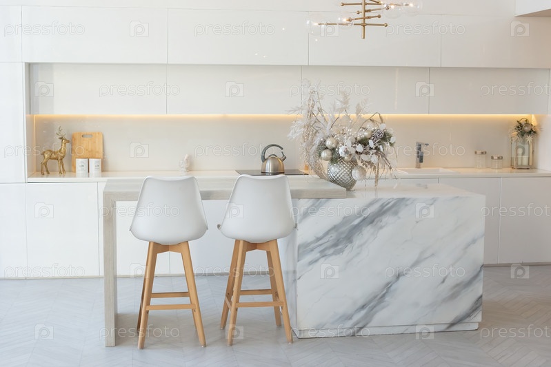 Кухня с белым интерьером, столом посередине, с серебряными рождественскими украшениями