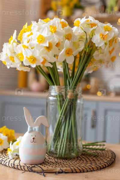 Милая керамическая фигурка зайчика стоит на кухонном столе рядом со стеклянной вазой с цветами нарциссов