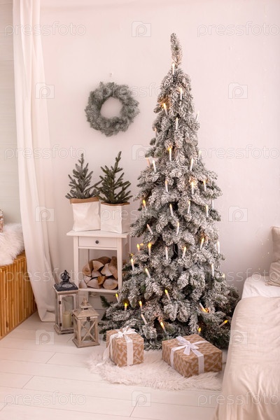 Заснеженная искусственная ель в подарочной упаковке в спальне