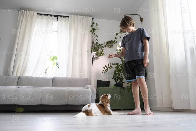 Мальчик, 10 лет, темные длинные волосы, дома командует собакой. милый щенок кавалер-кинг-чарльз-спаниеля. Дети играют и дрессируют собаку