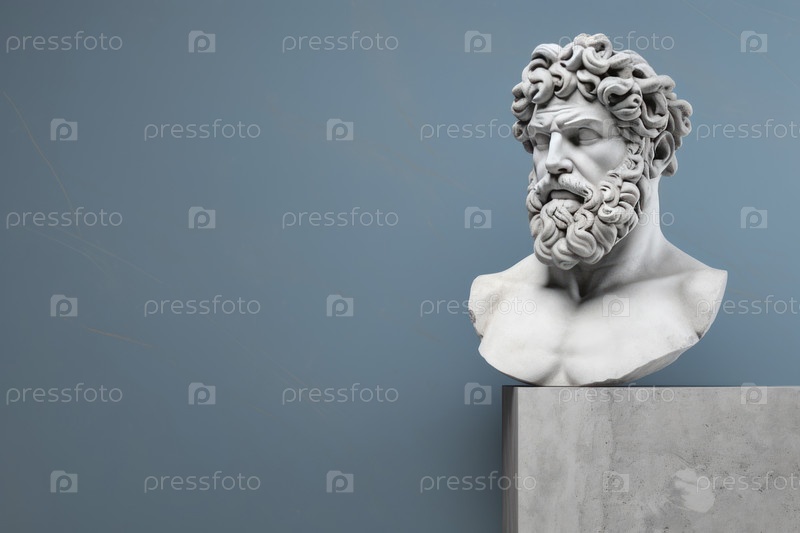 Каменный бюст греческого бога на постаменте. Скульптура древнего римского мужчины