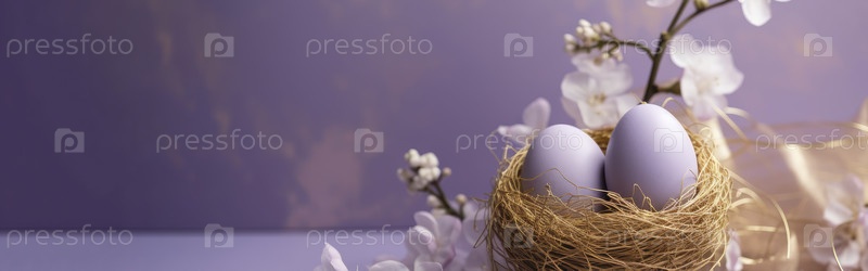 Весенний фиолетовый, сиреневый фон с золотыми пасхальными яйцами в гнезде и свежими цветами. пространство для копирования, место для текста