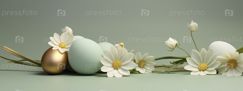 Весенний фон с золотисто-зелеными пасхальными яйцами и свежими цветами. пространство для копирования, баннер