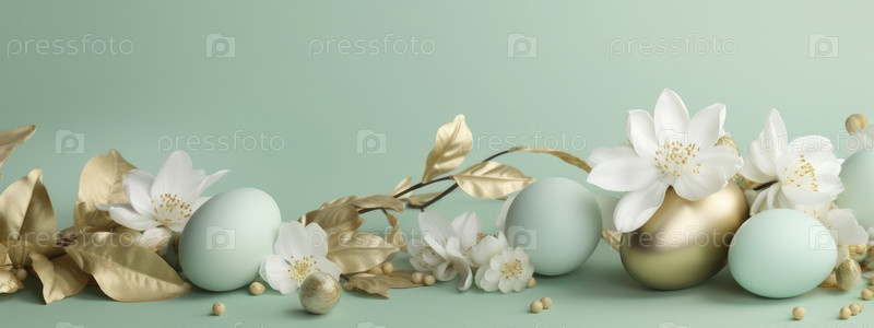 Баннер, весенний фон с золотисто-зелеными пасхальными яйцами и свежими цветами. пространство для копирования, место для текста