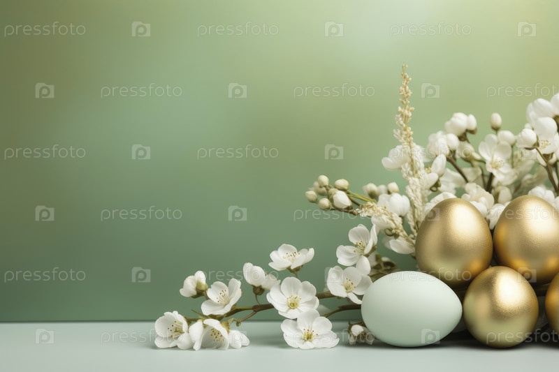 Весенний фон с золотисто-зелеными пасхальными яйцами и свежими цветами. пространство для копирования, место для текста