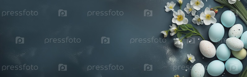 Баннер, весенний фон с золотыми бирюзовыми пасхальными яйцами и свежими цветами. пространство для копирования, место для текста
