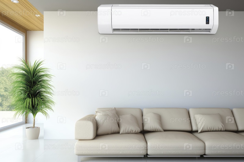 Кондиционер на стене в современном интерьере, воздушное охлаждение. Копировать пространство
