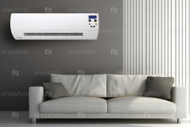 Кондиционер на стене в современном интерьере, воздушное охлаждение. Копировать пространство