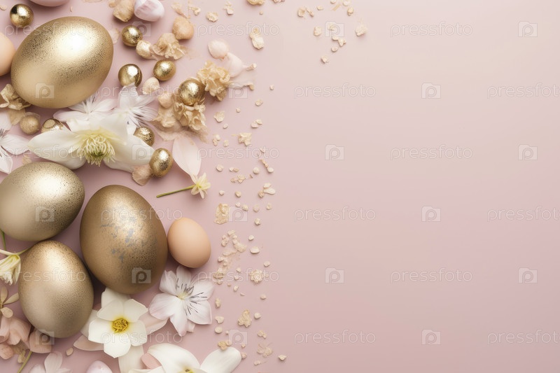 Весенний фон с золотыми пасхальными яйцами и свежими цветами. место для копирования Peachy Fuzz, место для текста